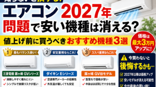 エアコン【2026年最新版】エアコン2027年問題とは?値上げ前に買うべき機種3選 エアコン2027年問題で安い機種がなくなる?価格上昇の理由と今買うべきタイミングを解説。おすすめ機種3選と失敗しない選び方も紹介します。 2026.04.30エアコン